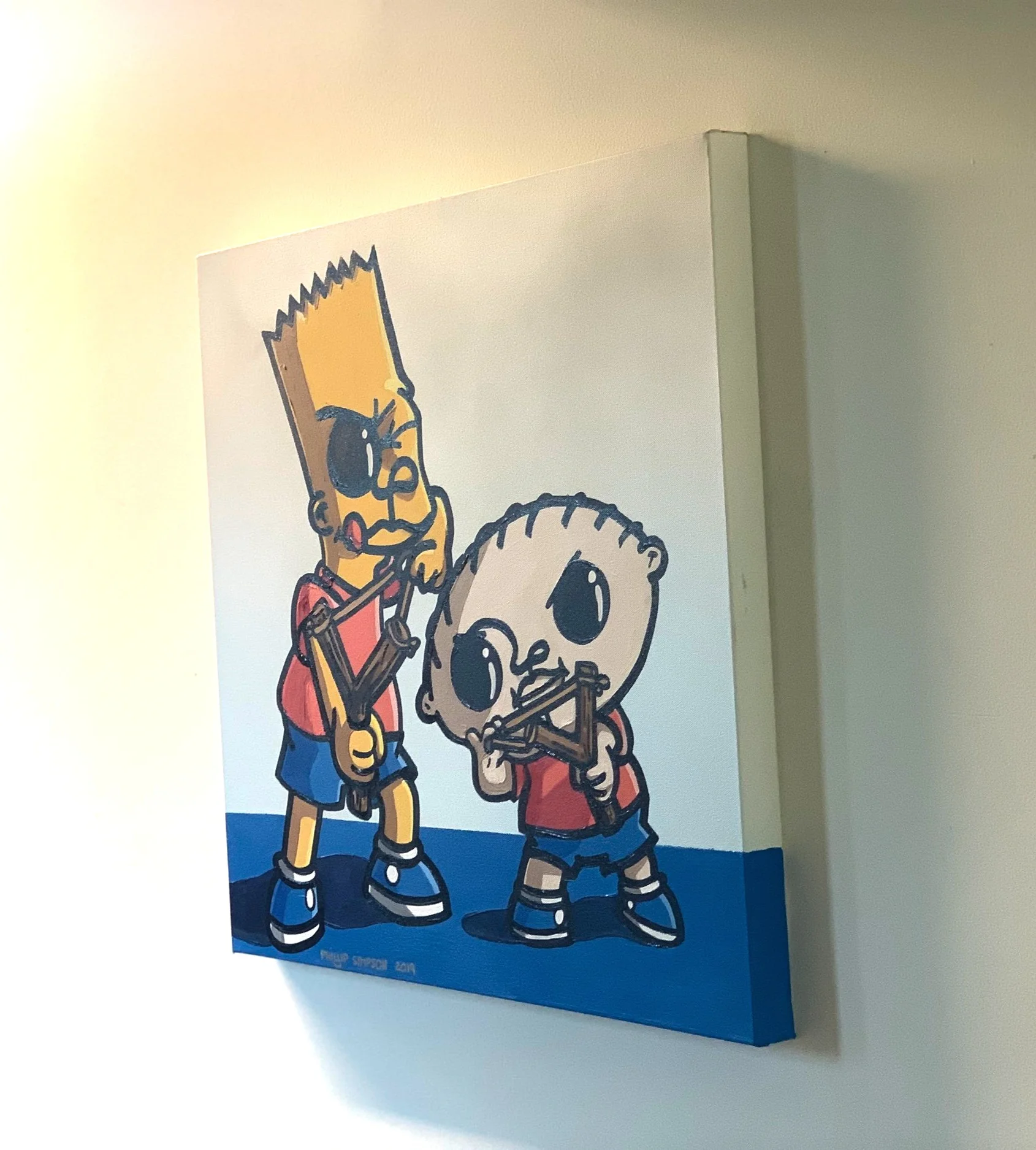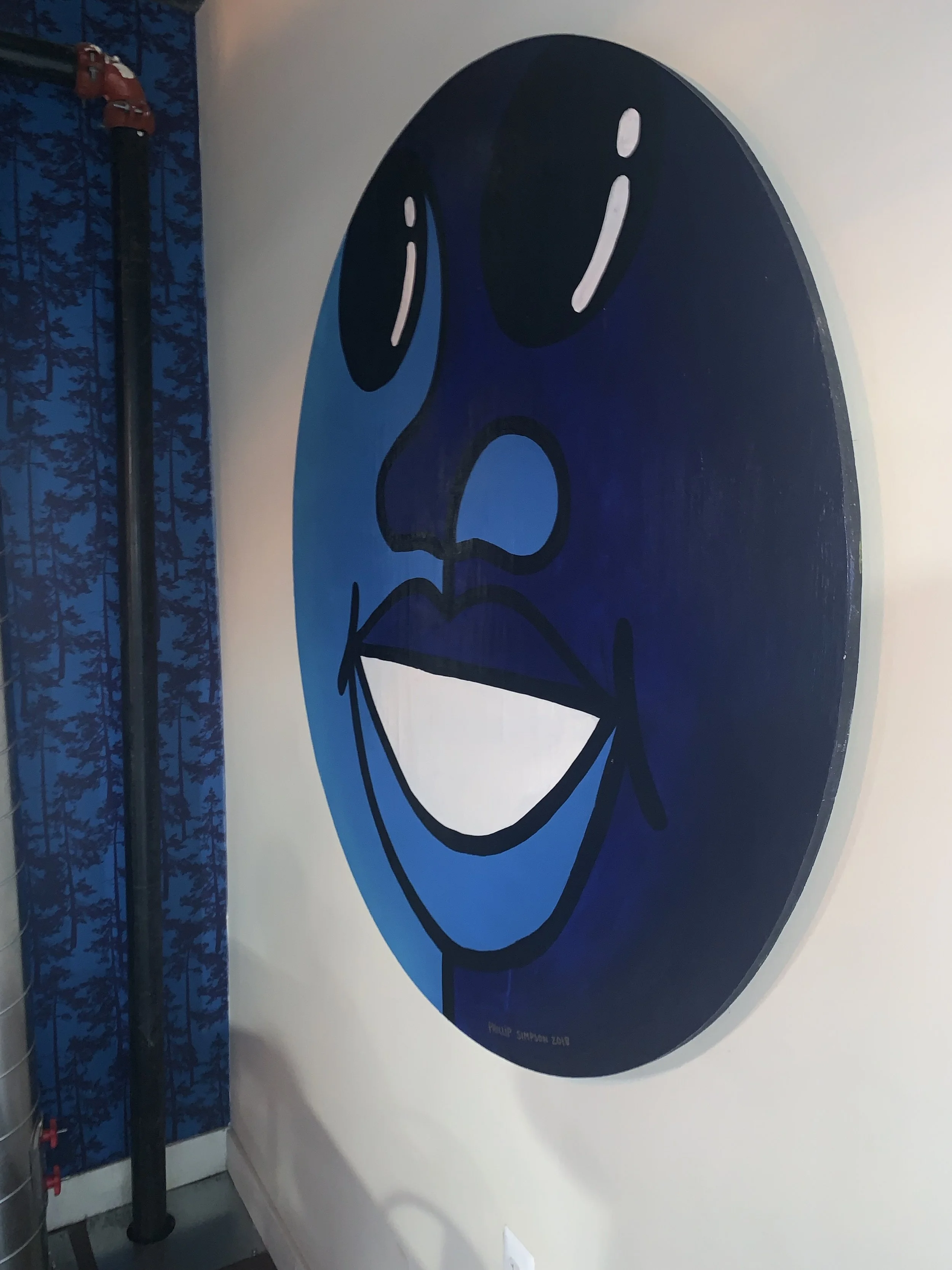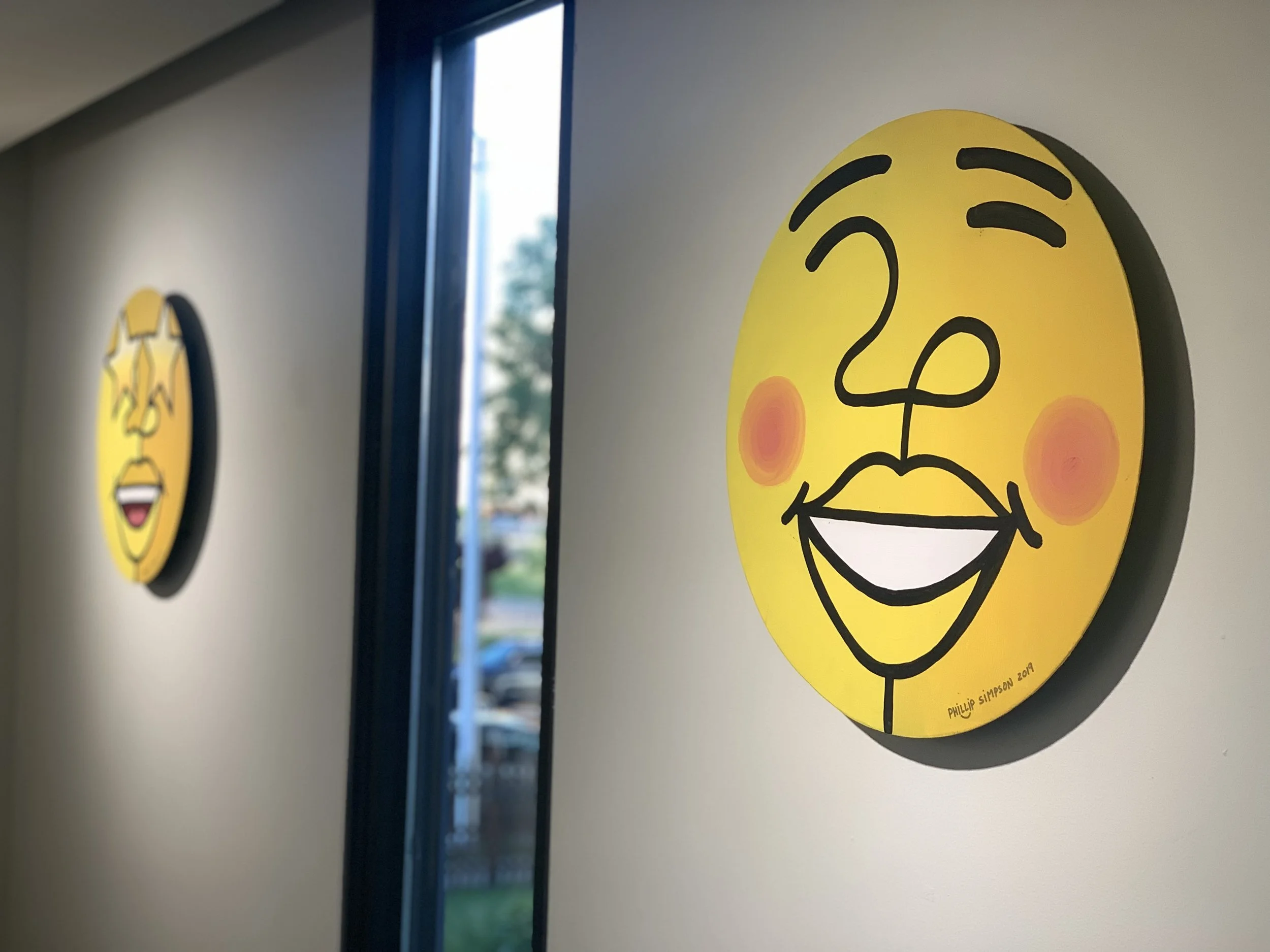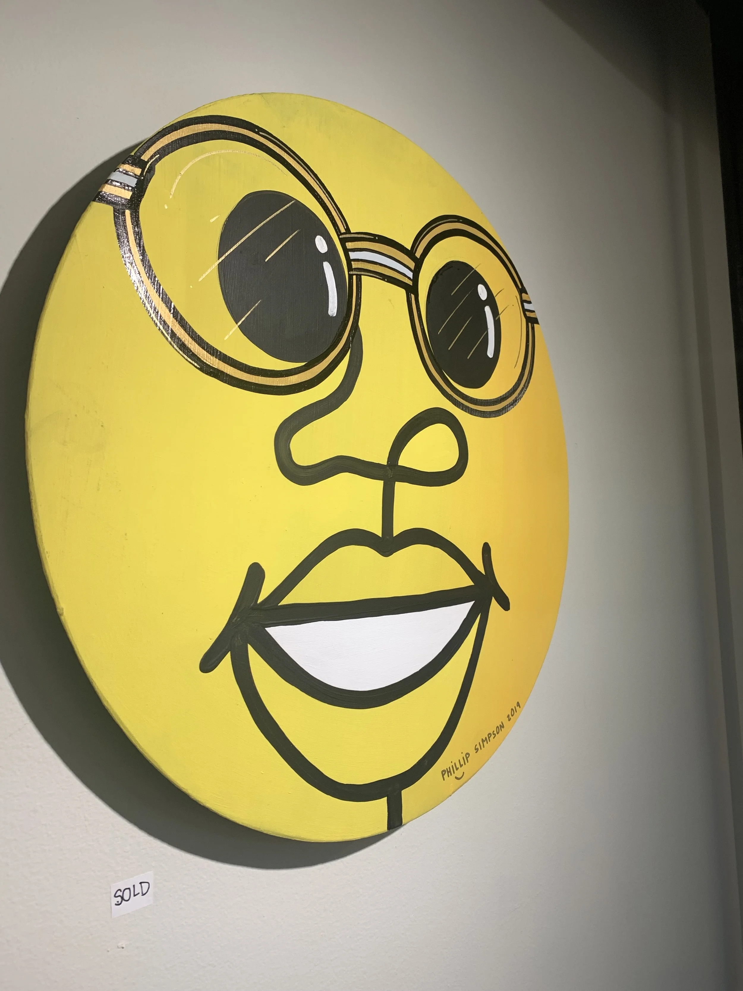 I recently stopped by to see “Go for It: An Exhibition by Phil Simpson”. The Detroit artist’s “Smile” art does just that, you can’t help but to smile when looking at his work. Mission accomplished as getting us to smile is the goal. Showing in the main gallery, his work features bright colors, some well-known characters, and our favorite emojis.